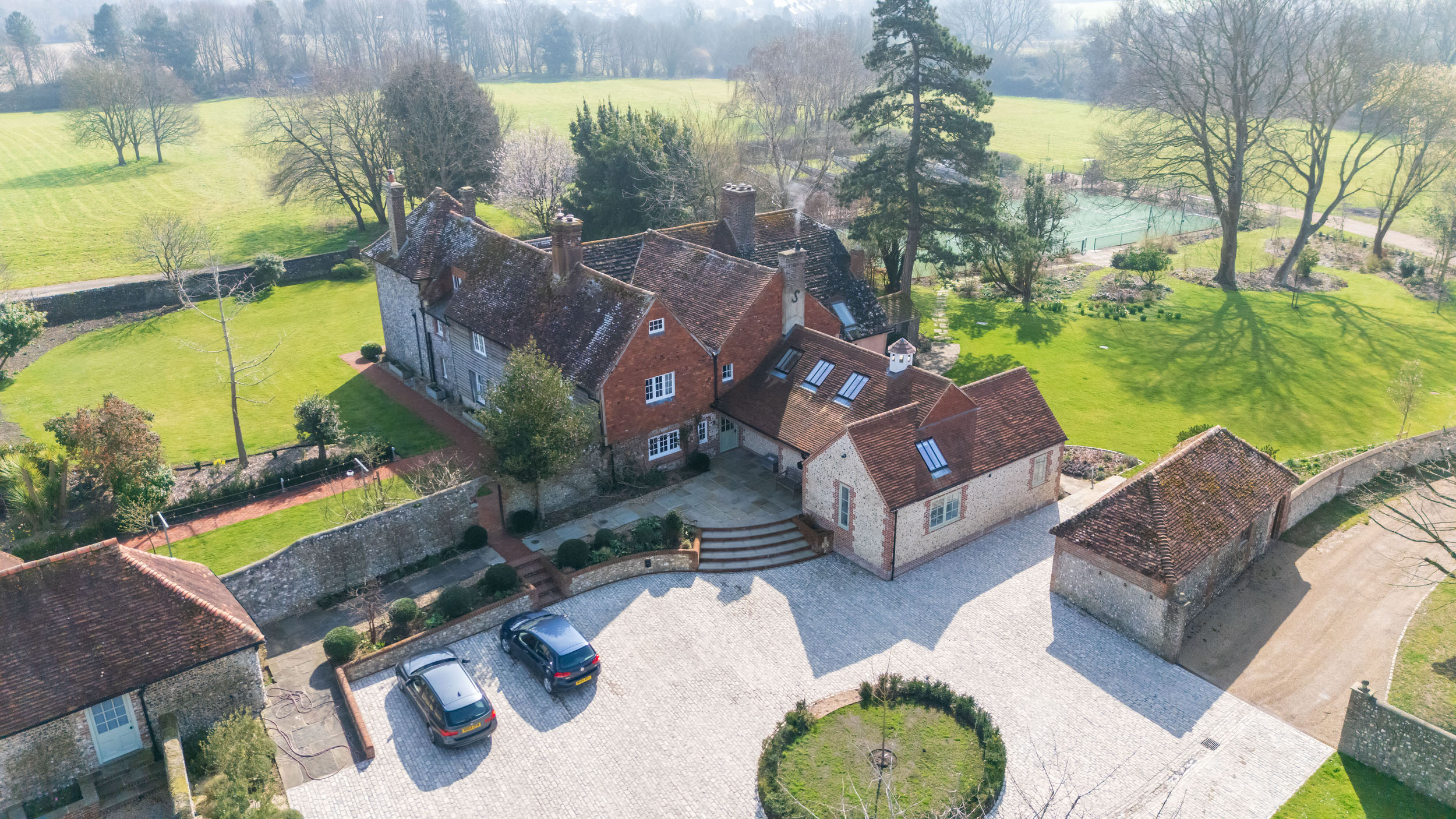 Also, within the grounds, MSBC have also constructed a tennis court, have expanded and redesigned a pool, and delivered a new large solar array. This 50kw install will provide most of the power required on site, with 26kw of battery storage, and with surplus being fed back into the grid. To facilitate this, we introduced 3 phase power and a sophisticated energy management system, moving the sites predominant energy source from gas to electric. These installs have been carefully designed to nest within the landscape in such a way as to make them concealed from the South Downs.