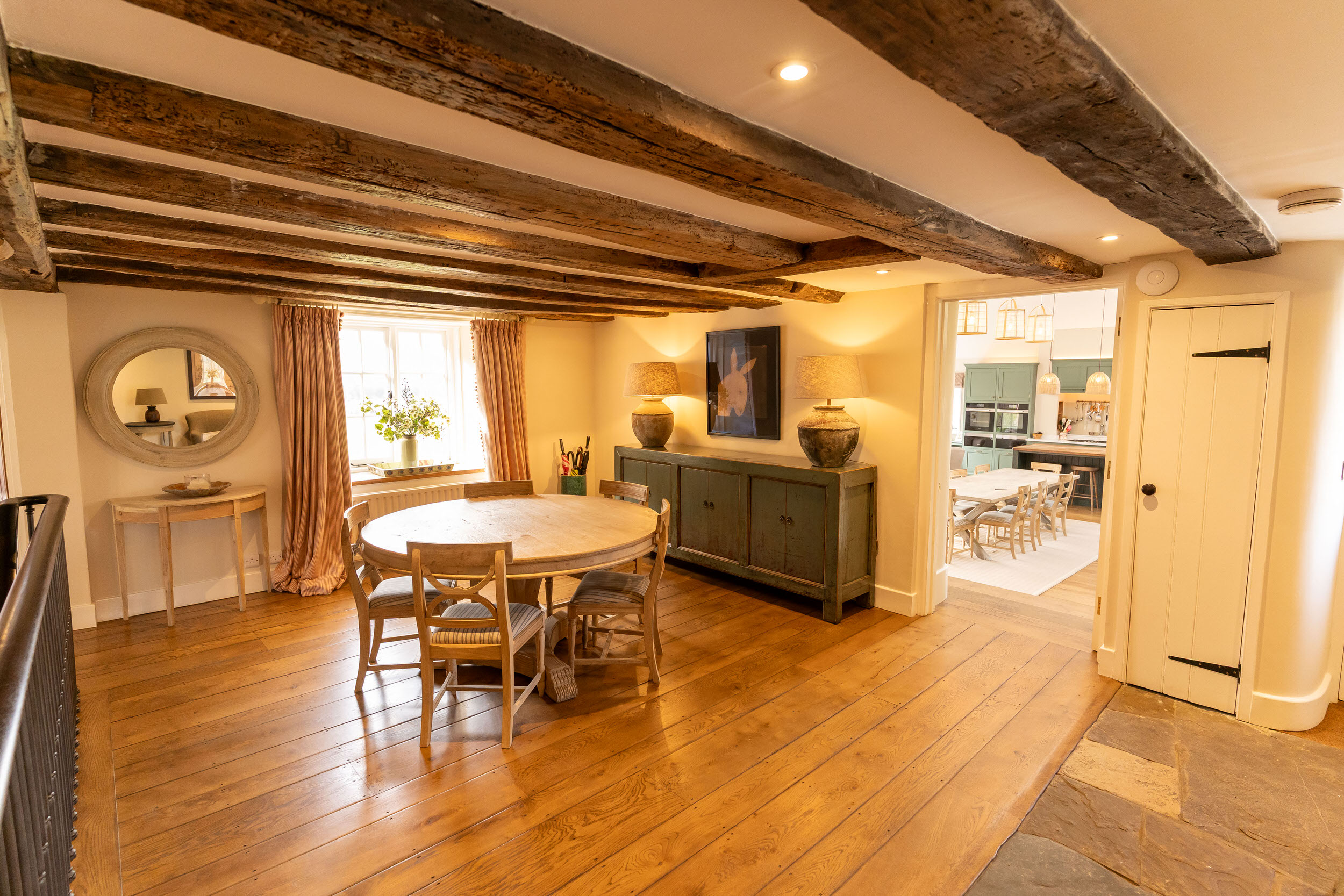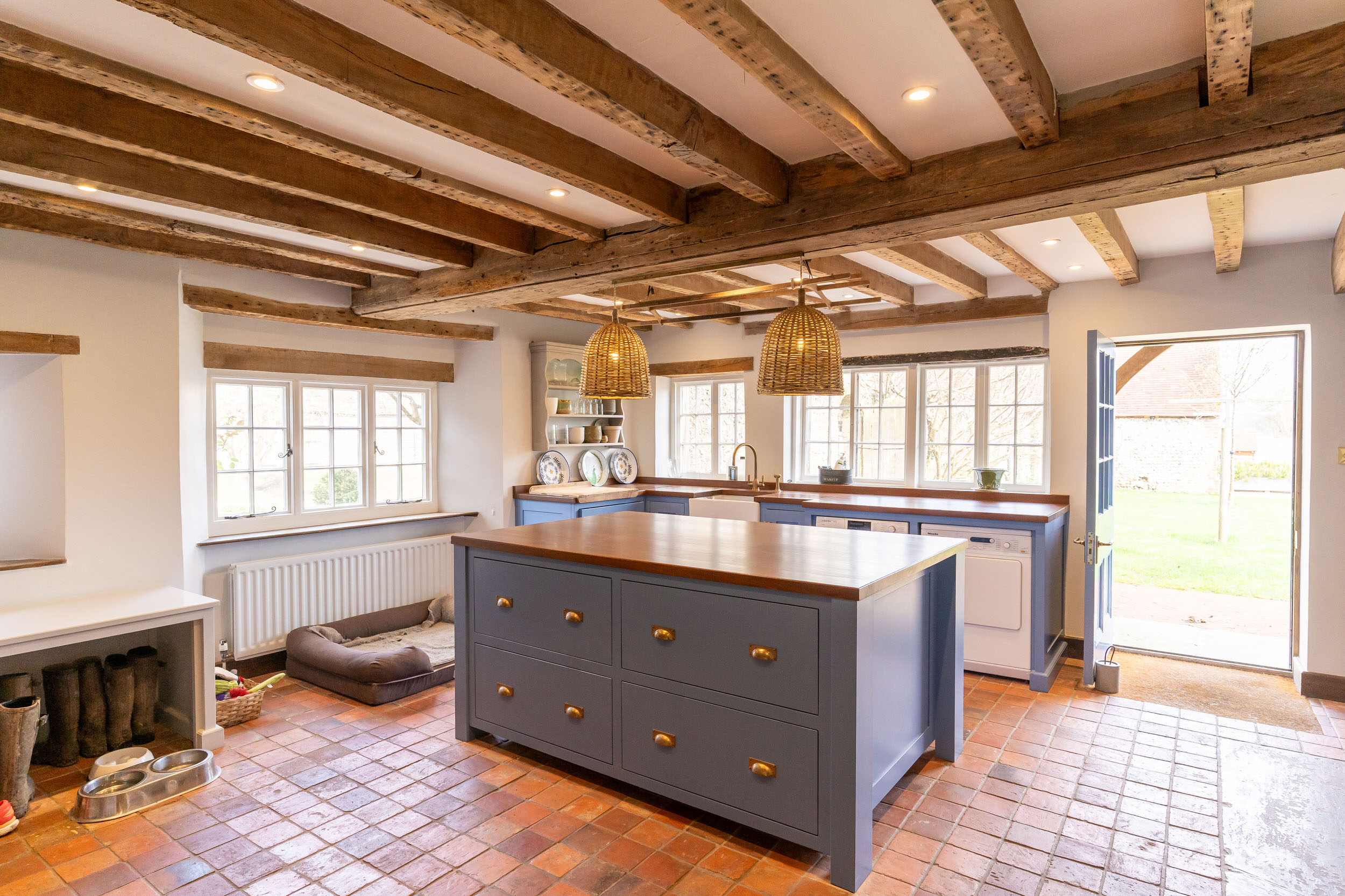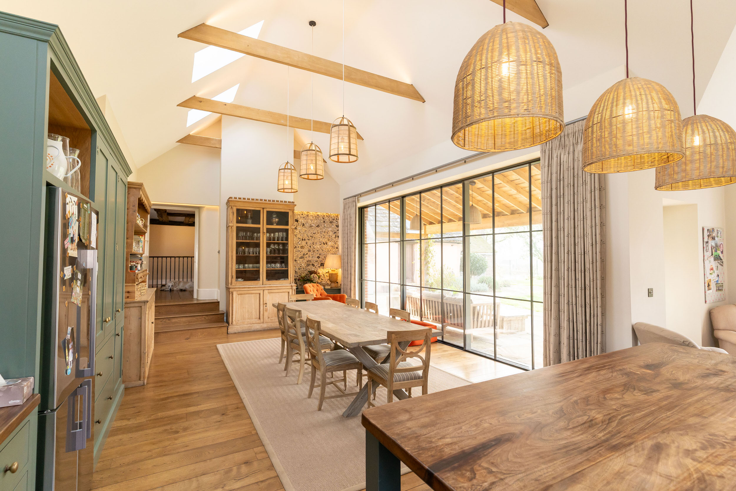 This included sensitive works to various outbuildings, and the reorientation of the main house through the construction of a substantial modern kitchen family room. The challenge was to make this large new space subservient to the main house, blending in with its original fabrics – all whilst delivering light, height, volume, and energy efficiency.
