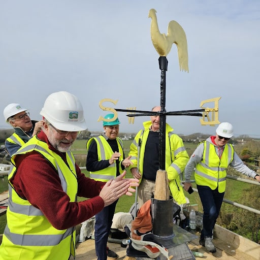 The second is the repair and restoration works at St Peter & St Paul’s Church, West Wittering. We were instructed to completely strip and recover the towering oak shake spire, including all flashings and abutments. During this time, we took the opportunity to restore, repair and re-gild the weathervane and cockerel, and rebuild the oak timber shutters to the upper floor, which houses the bells. This presented some unique challenges. We had to consider the positioning of the scaffold carefully, given that the spire sits within the burial grounds, we temporarily protected headstones, and stuck to designated routes around the site.